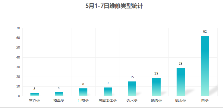 对学校公共设施进行日常巡查、维护,发现问题及时维修、抢修。对师生报修问题随报随修,确保公共设施正常运行。 本周共接单149单,其中电类62单,给水类15单,门窗类8单,排水类29单,疏通类19单,房屋本体类9单,桌椅类4单,其他类3单,完成149单。
