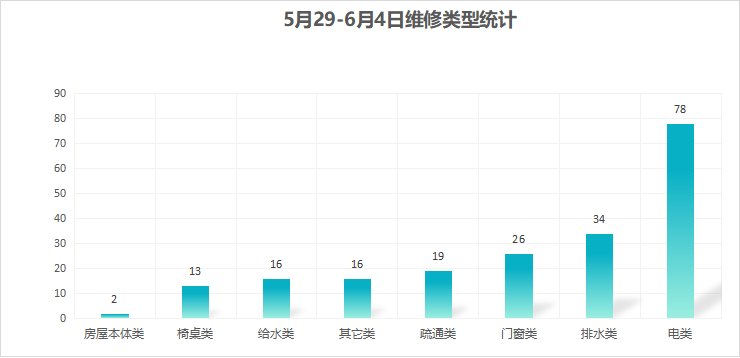 对学校公共设施进行日常巡查、维护,发现问题及时维修、抢修。师生报修问题随报随修,确保公共设施正常运行。本周共接单204单,其中电类78单,给水类16单,门窗类26单,排水类34单,疏通类19单,房屋本体类2单,桌椅类13单,其他类16单,完成196单。