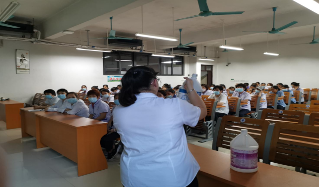 对公共教学楼宇的楼梯、走廊、门把手、课桌椅、电脑键盘、鼠标、水龙头、楼梯扶手、电梯间及按钮等高频接触表面进行重点杀菌消毒956次。