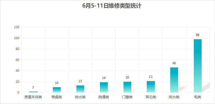对学校公共设施进行日常巡查、维护,发现问题及时维修、抢修。师生报修问题随报随修,确保公共设施正常运行。本周共接单229单,其中电类98单,给水类13单,门窗类20单,排水类46单,疏通类19单,房屋本体类2单,桌椅类10单,其他类21单,完成217单。