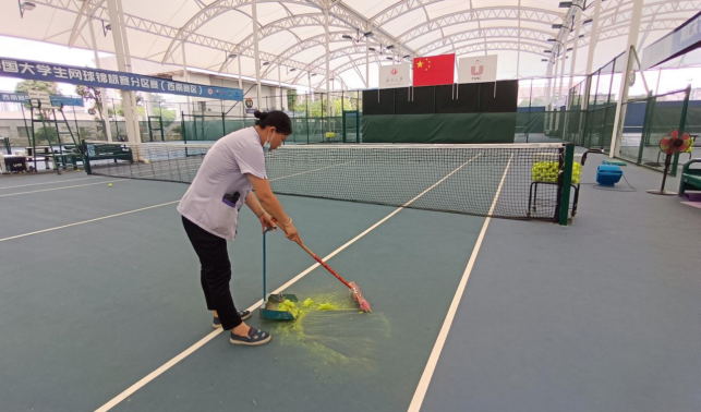 对东体育馆、网球中心、体育学院进行日常卫生保洁工作。