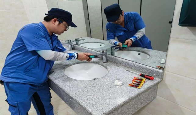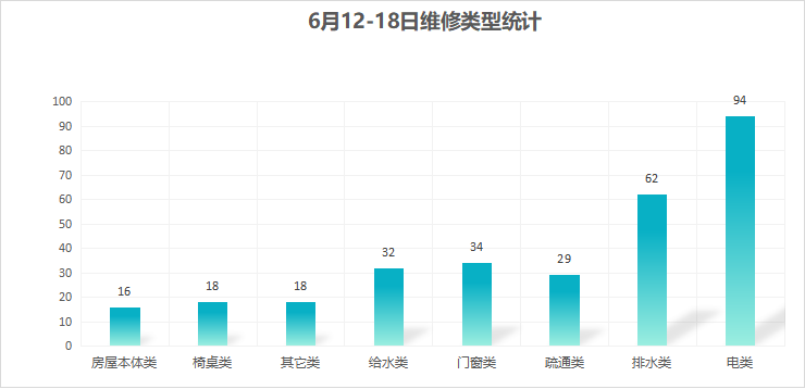 对学校公共设施进行日常巡查、维护,发现问题及时维修、抢修。师生报修问题随报随修,确保公共设施正常运行。本周共接单303单,其中电类94单,给水类32单,门窗类34单,排水类62单,疏通类29单,房屋本体类16单,桌椅类18单,其他类18单,完成288单。