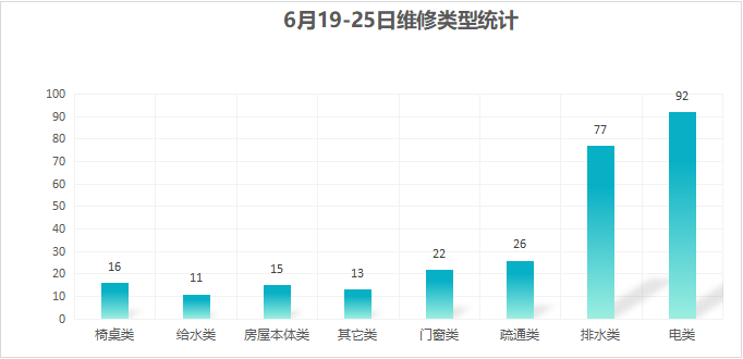 对学校公共设施进行日常巡查、维护,发现问题及时维修、抢修。师生报修问题随报随修,确保公共设施正常运行。本周共接单272单,其中电类92单,给水类11单,门窗类22单,排水类77单,疏通类26单,房屋本体类15单,桌椅类16单,其他类13单,完成260单。