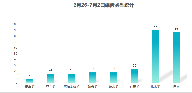 对学校公共设施进行日常巡查、维护,发现问题及时维修、抢修。师生报修问题随报随修,确保公共设施正常运行。本周共接单276单,其中电类86单,给水类19单,门窗类23单,排水类91单,疏通类19单,房屋本体类15单,桌椅类7单,其他类16单,完成261单。