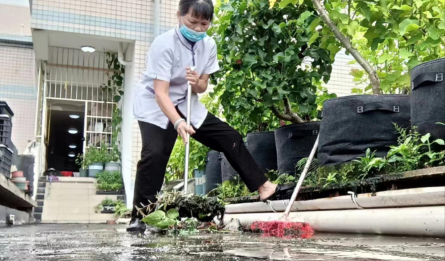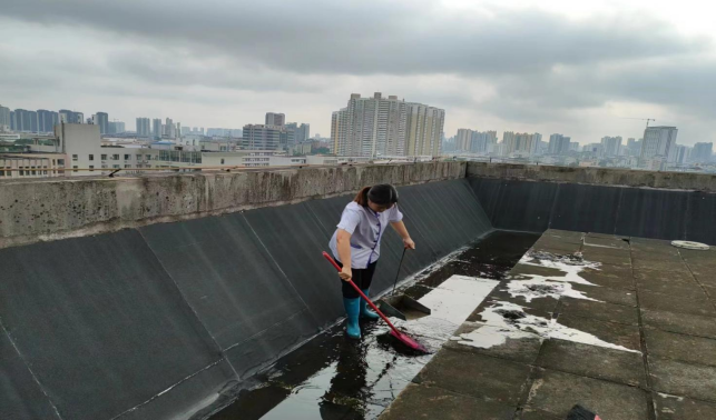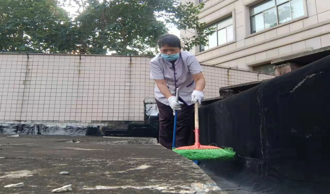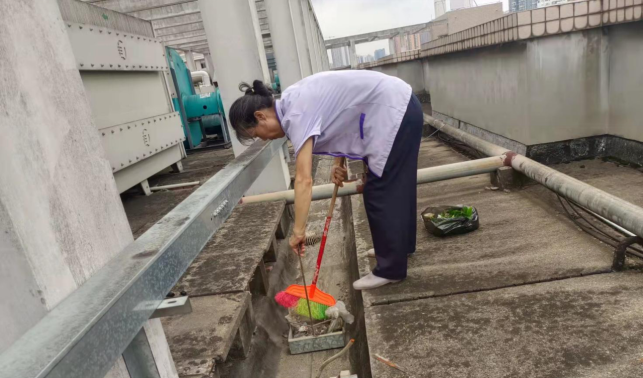 清理资环材学院楼宇天台和排水设施内淤泥和杂草