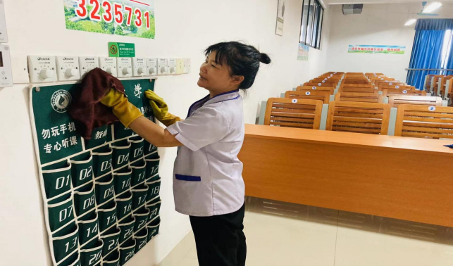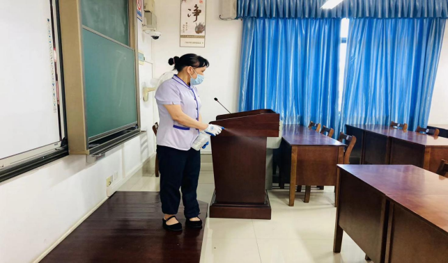 对公共教学楼宇的楼梯、走廊、门把手、课桌椅、电脑键盘、鼠标、水龙头、楼梯扶手、电梯间及按钮等高频接触表面进行重点杀菌消毒6718次。