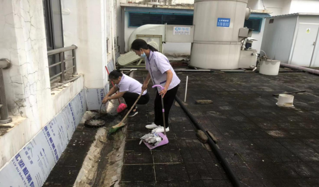 清理物理学院楼宇天台和排水设施内淤泥和杂草