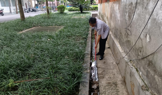 清理医学院楼宇外围排水设施内杂物和杂草