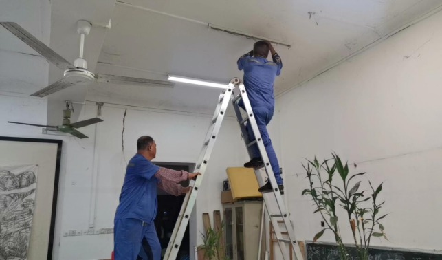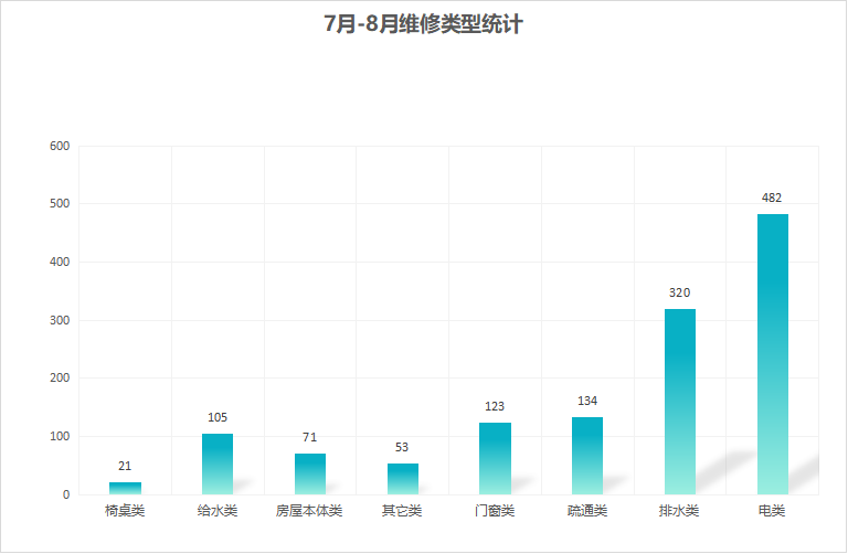 对学校公共设施进行日常巡查、维护,发现问题及时维修、抢修。师生报修问题随报随修,确保公共设施正常运行。暑期共接单1309单,其中电类482单,给水类105单,门窗类123单,排水类320单,疏通类134单,房屋本体类71单,桌椅类21单,其他类53单,完成1269单。