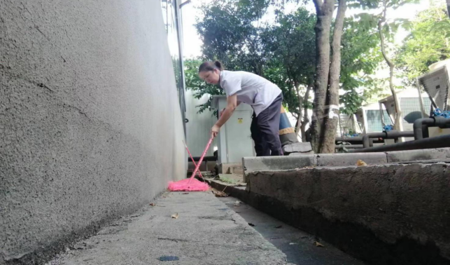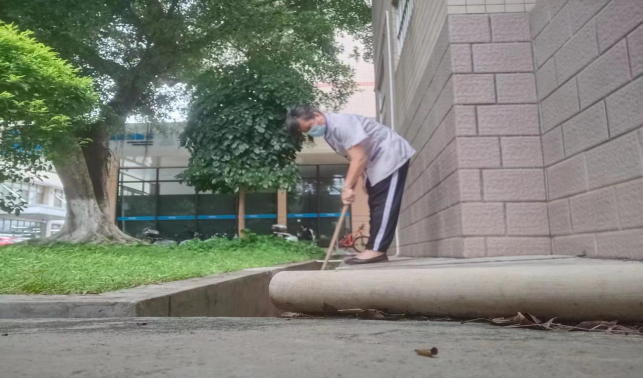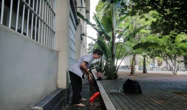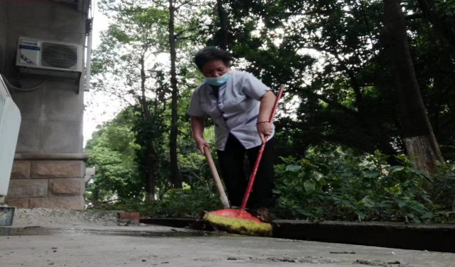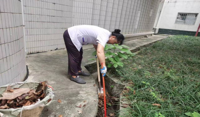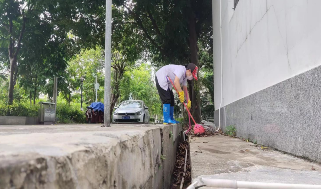 清理环境学院楼宇外围排水设施内淤泥和杂草
