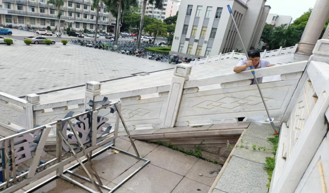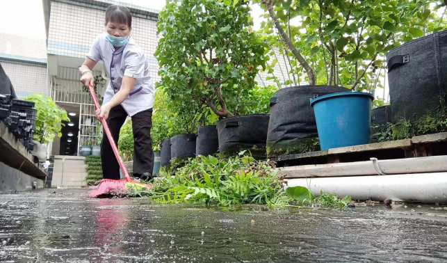 清理林学院楼宇天台排水设施内淤泥和杂草