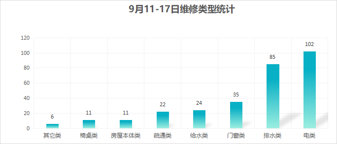 对学校公共设施进行日常巡查、维护,发现问题及时维修、抢修。师生报修问题随报随修,确保公共设施正常运行。本周共接单296单,其中电类102单,给水类24单,门窗类35单,排水类85单,疏通类22单,房屋本体类11单,桌椅类11单,其他类6单,完成280单。