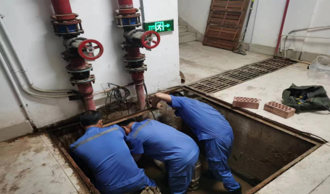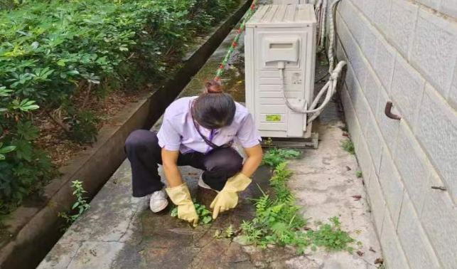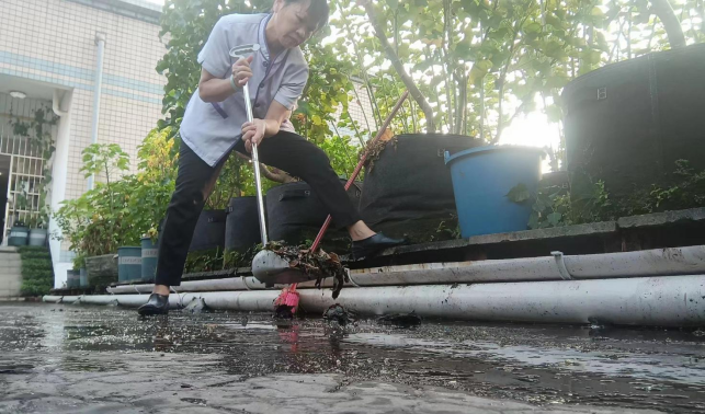 清理国际学院楼宇天台排水设施内淤泥和杂草