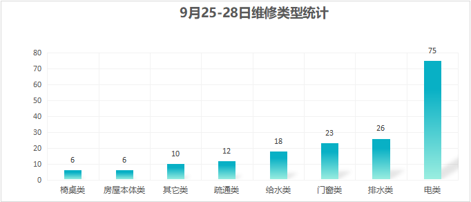 对学校公共设施进行日常巡查、维护,发现问题及时维修、抢修。师生报修问题随报随修,确保公共设施正常运行。本周共接单176单,其中电类75单,给水类18单,门窗类23单,排水类26单,疏通类12单,房屋本体类6单,桌椅类6单,其他类10单,完成170单。