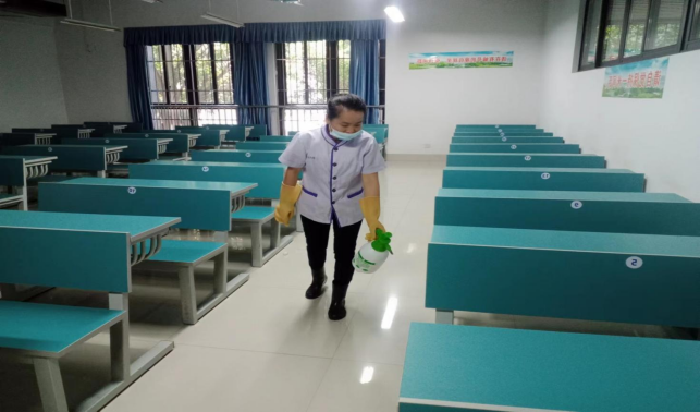 对公共教学楼宇的楼梯、走廊、门把手、课桌椅、电脑键盘、鼠标、水龙头、楼梯扶手、电梯间及按钮等高频接触表面进行重点杀菌消毒629次。