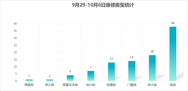 对学校公共设施进行日常巡查、维护,发现问题及时维修、抢修。师生报修问题随报随修,确保公共设施正常运行。本周共接单96单,其中电类38单,给水类7单,门窗类14单,排水类18单,疏通类13单,房屋本体类4单,桌椅类1单,其他类1单,完成96单。