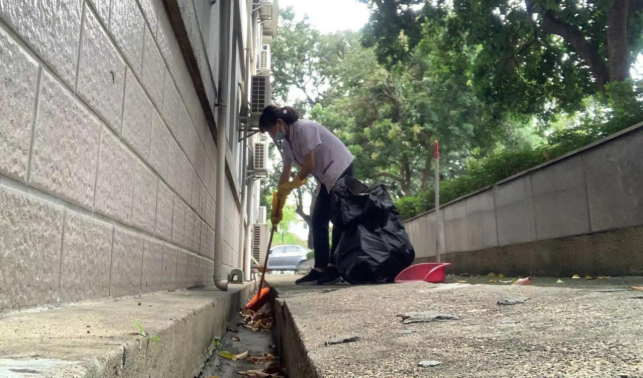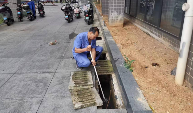 清理语言中心楼宇外围排水设施内杂物和杂草