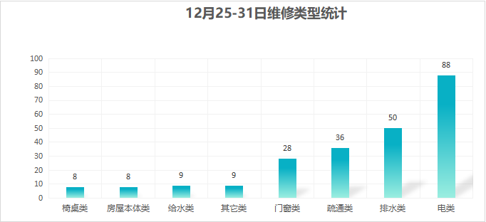 对学校公共设施进行日常巡查、维护,对师生报修问题及时维修、抢修,确保公共设施设备正常使用。本周共接单236单,其中电类88单,给水类9单,门窗类28单,排水类50单,疏通类36单,房屋本体类8单,桌椅类8单,其他类9单,完成236单。