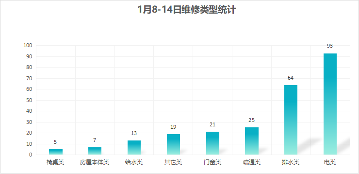 对学校公共设施进行日常巡查、维护,对师生报修问题及时维修、抢修,确保公共设施设备正常使用。本周共接单247单,其中电类93单,给水类13单,门窗类21单,排水类64单,疏通类25单,房屋本体类7单,桌椅类5单,其他类19单,完成240单。
