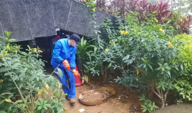 清理体育红楼楼宇外围排水设施内杂物