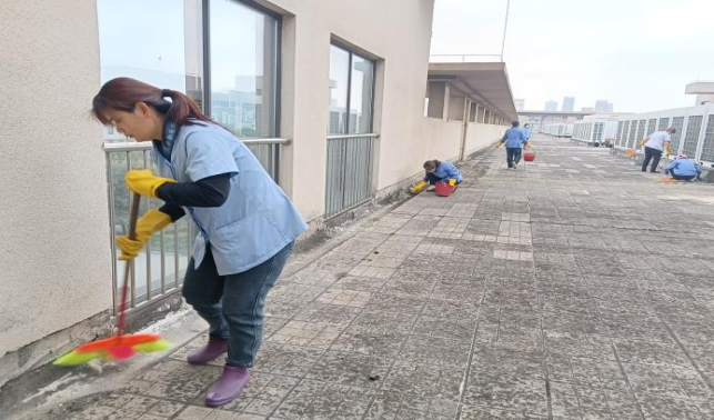 对语言中心、二教、三教、六教、十教、十一教、研究生院和行健学院教室等教学楼宇进行日常卫生保洁服务工作,本周清理公共楼宇排水设施48次,清理公共楼宇天台37处。