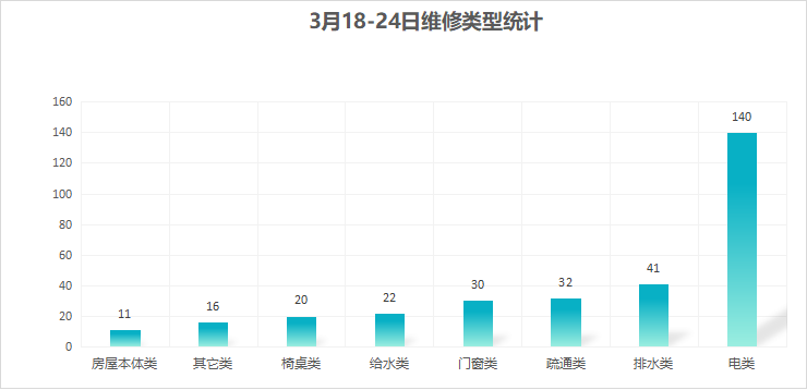对学校公共设施进行日常巡查、维护,对师生报修问题及时维修、抢修,确保公共设施设备正常使用。本周共接单312单,其中电类140单,给水类22单,门窗类30单,排水类41单,疏通类32单,房屋本体类11单,桌椅类20单,其他类16单,完成300单。