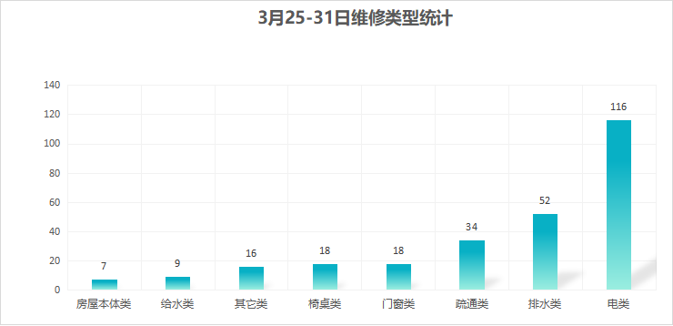 对学校公共设施进行日常巡查、维护,对师生报修问题及时维修、抢修,确保公共设施设备正常使用。本周共接单270单,其中电类116单,给水类9单,门窗类18单,排水类52单,疏通类34单,房屋本体类7单,桌椅类18单,其他类16单,完成257单。