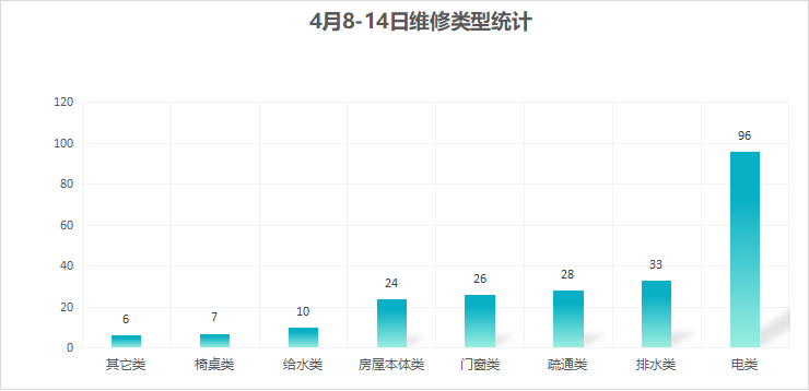 对学校公共设施进行日常巡查、维护,对师生报修问题及时维修、抢修,确保公共设施设备正常使用。本周共接单230单,其中电类96单,给水类10单,门窗类26单,排水类33单,疏通类28单,房屋本体类24单,桌椅类7单,其他类6单,完成218单。