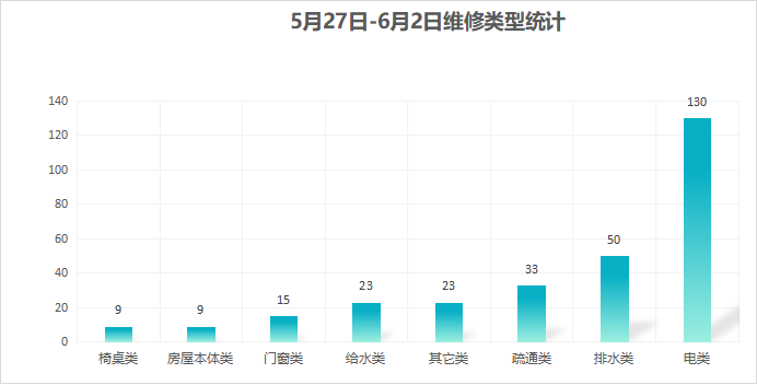 对学校公共设施进行日常巡查、维护,对师生报修问题及时维修、抢修,确保公共设施设备正常使用。本周共接单292单,其中电类130单,给水类23单,门窗类15单,排水类50单,疏通类33单,房屋本体类9单,桌椅类9单,其他类23单,完成292单。