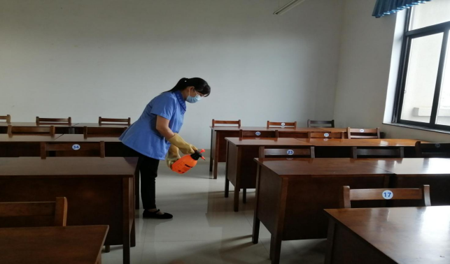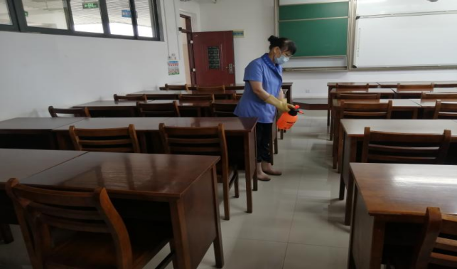 对公共教学楼宇的楼梯、走廊、门把手、课桌椅、电脑键盘、鼠标、水龙头、楼梯扶手、电梯间及按钮等高频接触表面进行重点杀菌消毒657次。