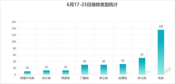 对学校公共设施进行日常巡查、维护,对师生报修问题及时维修、抢修,确保公共设施设备正常使用。本周共接单315单,其中电类136单,给水类13单,门窗类30单,排水类51单,疏通类32单,房屋本体类10单,桌椅类13单,其他类30单,完成299单。