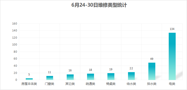 对学校公共设施进行日常巡查、维护,对师生报修问题及时维修、抢修,确保公共设施设备正常使用。本周共接单274单,其中电类134单,给水类22单,门窗类11单,排水类49单,疏通类18单,房屋本体类5单,桌椅类19单,其他类16单,完成260单。