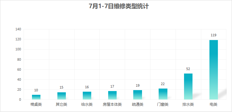 对学校公共设施进行日常巡查、维护,对师生报修问题及时维修、抢修,确保公共设施设备正常使用。本周共接单270单,其中电类119单,给水类16单,门窗类22单,排水类52单,疏通类19单,房屋本体类17单,桌椅类10单,其他类15单,完成266单。