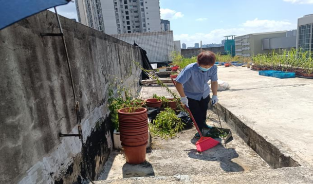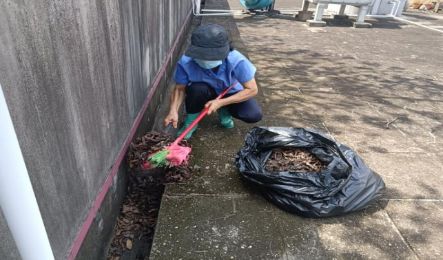 清理农学院楼宇天台排水设施