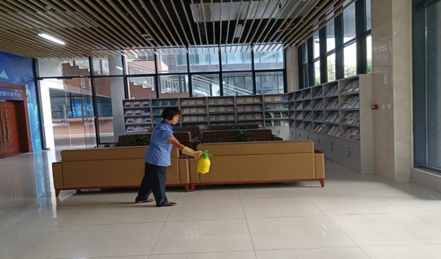 对公共教学楼宇的楼梯、走廊、门把手、课桌椅、电脑键盘、鼠标、水龙头、楼梯扶手、电梯间及按钮等高频接触表面进行重点杀菌消毒619次。