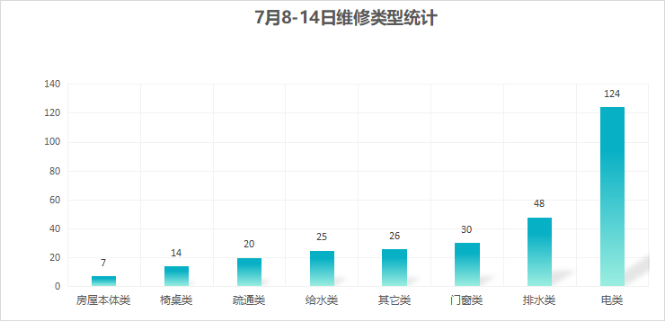 对学校公共设施进行日常巡查、维护,对师生报修问题及时维修、抢修,确保公共设施设备正常使用。本周共接单294单,其中电类124单,给水类25单,门窗类30单,排水类48单,疏通类20单,房屋本体类7单,桌椅类14单,其他类26单,完成294单。