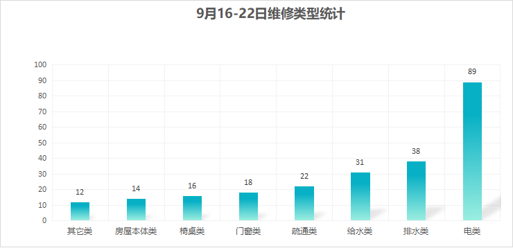 对学校公共设施进行日常巡查、维护,对师生报修问题及时维修、抢修,确保公共设施设备正常使用。本周共接单236单,其中电类89单,给水类31单,门窗类18单,排水类38单,疏通类22单,房屋本体类14单,桌椅类16单,其他类12单,完成240单。