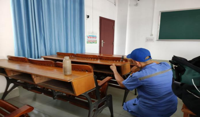 对公共教学楼宇的楼梯、走廊、门把手、课桌椅、电脑键盘、鼠标、水龙头、楼梯扶手、电梯间及按钮等高频接触表面进行重点杀菌消毒553次。