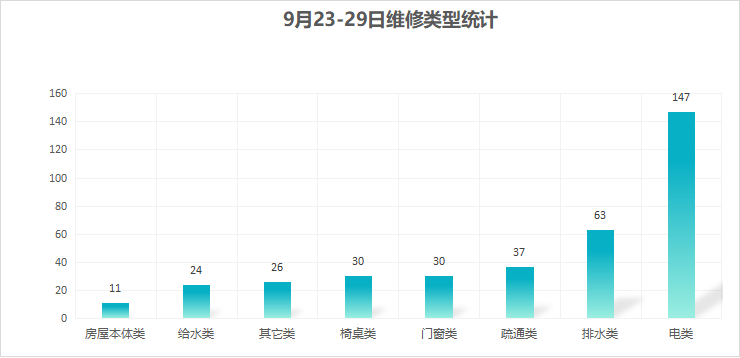 对学校公共设施进行日常巡查、维护,对师生报修问题及时维修、抢修,确保公共设施设备正常使用。本周共接单368单,其中电类147单,给水类24单,门窗类30单,排水类63单,疏通类37单,房屋本体类11单,桌椅类30单,其他类26单,完成368单。