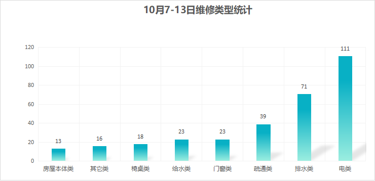 对学校公共设施进行日常巡查、维护,对师生报修问题及时维修、抢修,确保公共设施设备正常使用。本周共接单314单,其中电类111单,给水类23单,门窗类23单,排水类71单,疏通类39单,房屋本体类13单,桌椅类18单,其他类16单,完成298单。
