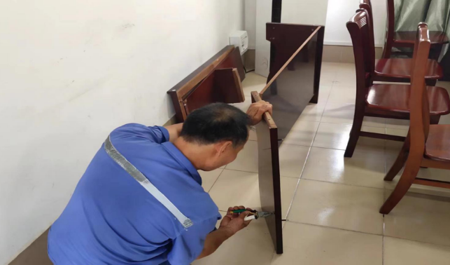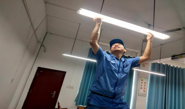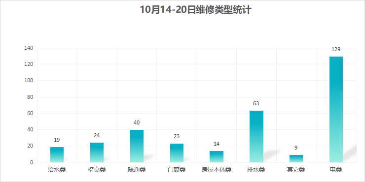 对学校公共设施进行日常巡查、维护,对师生报修问题及时维修、抢修,确保公共设施设备正常使用。本周共接单321单,其中电类129单,给水类19单,门窗类23单,排水类63单,疏通类40单,房屋本体类14单,桌椅类24单,其他类9单,完成318单。