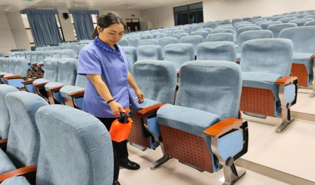 对公共教学楼宇的楼梯、走廊、门把手、课桌椅、电脑键盘、鼠标、水龙头、楼梯扶手、电梯间及按钮等高频接触表面进行重点杀菌消毒497次。
