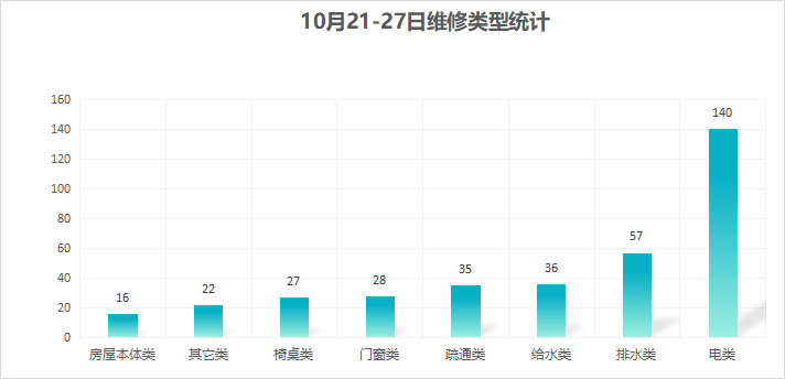 对学校公共设施进行日常巡查、维护,对师生报修问题及时维修、抢修,确保公共设施设备正常使用。本周共接单361单,其中电类140单,给水类36单,门窗类28单,排水类57单,疏通类35单,房屋本体类16单,桌椅类27单,其他类22单,完成352单。