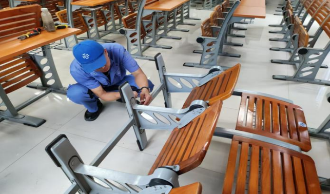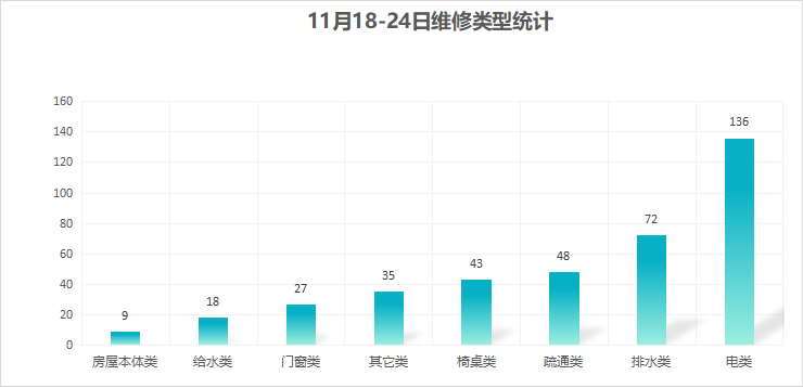 对学校公共设施进行日常巡查、维护,对师生报修问题及时维修、抢修,确保公共设施设备正常使用。本周共接单388单,其中电类136单,给水类18单,门窗类27单,排水类72单,疏通类48单,房屋本体类9单,桌椅类43单,其他类35单,完成361单。
