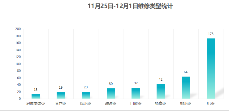 对学校公共设施进行日常巡查、维护,对师生报修问题及时维修、抢修,确保公共设施设备正常使用。本周共接单392单,其中电类173单,给水类20单,门窗类32单,排水类64单,疏通类30单,房屋本体类13单,桌椅类42单,其他类19单,完成393单。