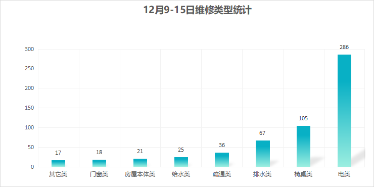 对学校公共设施进行日常巡查、维护,对师生报修问题及时维修、抢修,确保公共设施设备正常使用。本周共接单575单,其中电类286单,给水类25单,门窗类18单,排水类67单,疏通类36单,房屋本体类21单,桌椅类105单,其他类17单,完成526单。