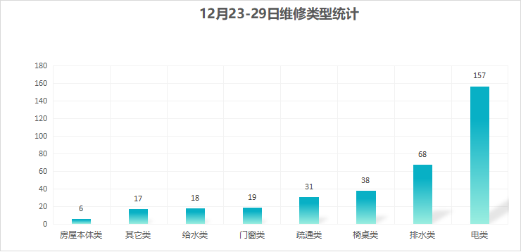 对学校公共设施进行日常巡查、维护,对师生报修问题及时维修、抢修,确保公共设施设备正常使用。本周共接单354单,其中电类157单,给水类18单,门窗类19单,排水类68单,疏通类31单,房屋本体类6单,桌椅类38单,其他类17单,完成346单。