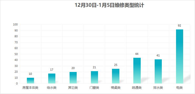 对学校公共设施进行日常巡查、维护,对师生报修问题及时维修、抢修,确保公共设施设备正常使用。本周共接单270单,其中电类92单,给水类17单,门窗类21单,排水类41单,疏通类44单,房屋本体类10单,桌椅类25单,其他类20单,完成270单。