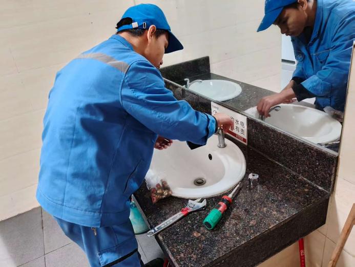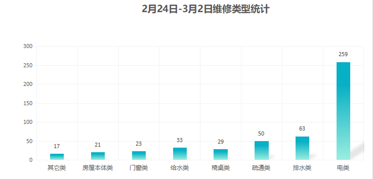 对学校公共设施进行日常巡查、维护,对师生报修问题及时维修、抢修,确保公共设施设备正常使用。本周共接单495单,其中电类259单,给水类33单,门窗类23单,排水类63单,疏通类50单,房屋本体类21单,桌椅类29单,其他类17单,完成495单。
