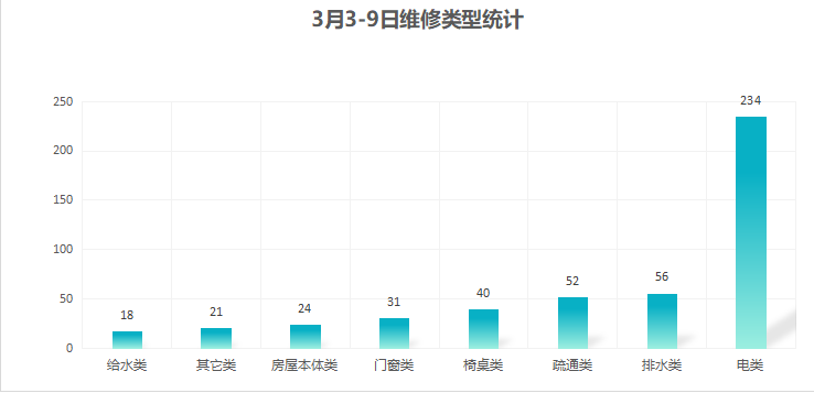 对学校公共设施进行日常巡查、维护,对师生报修问题及时维修、抢修,确保公共设施设备正常使用。本周共接单476单,其中电类234单,给水类18单,门窗类31单,排水类56单,疏通类52单,房屋本体类24单,桌椅类40单,其他类21单,完成447单。